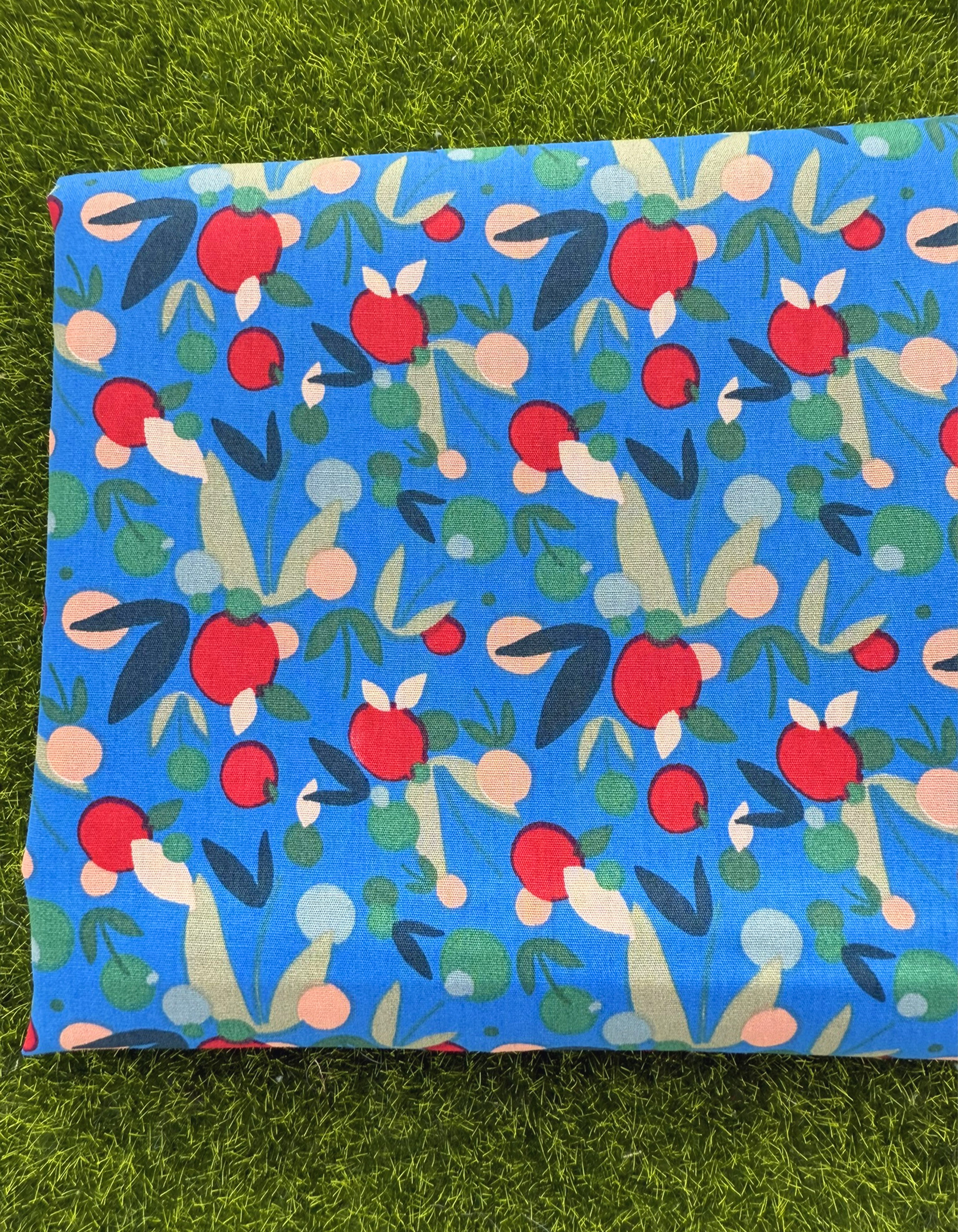 La popeline Blue Nuts se distingue par ses formes organiques et ses couleurs vibrantes : rouge grenadine, vert olive, touches saumon et fond bleu vif.
