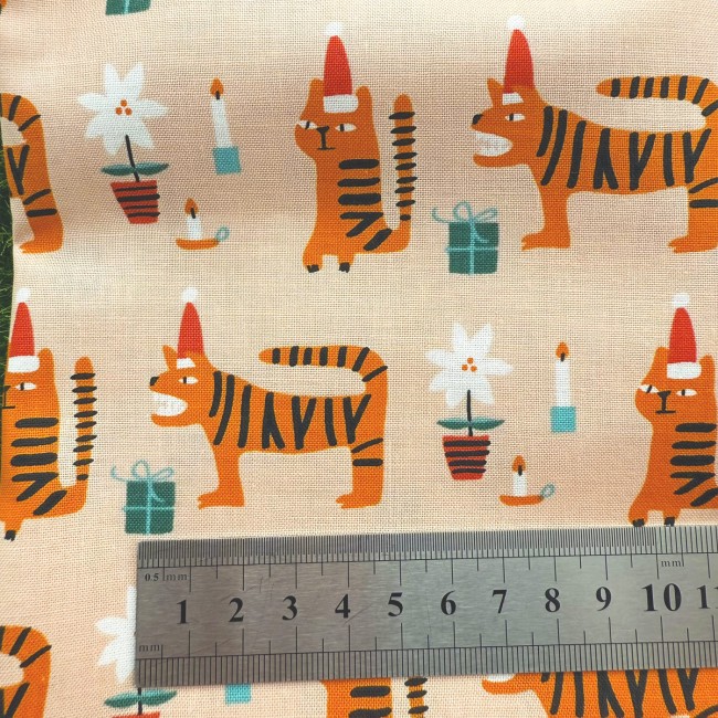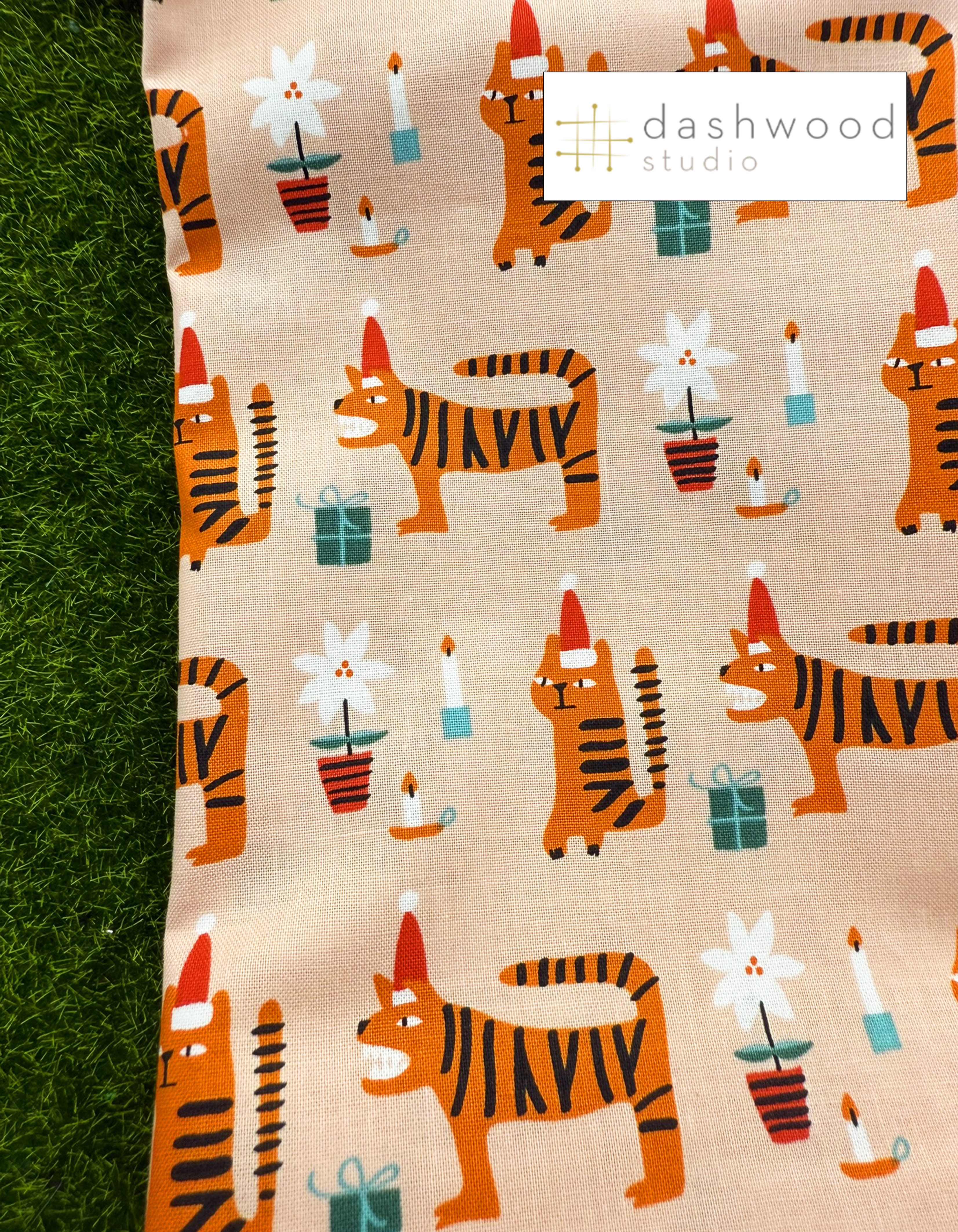 Ce tissu issu de la collection Christmas Party par Dashwood Studio revisite Noël avec des tigres malicieux coiffés de bonnets rouges, entourés de bougies, fleurs et cadeaux.