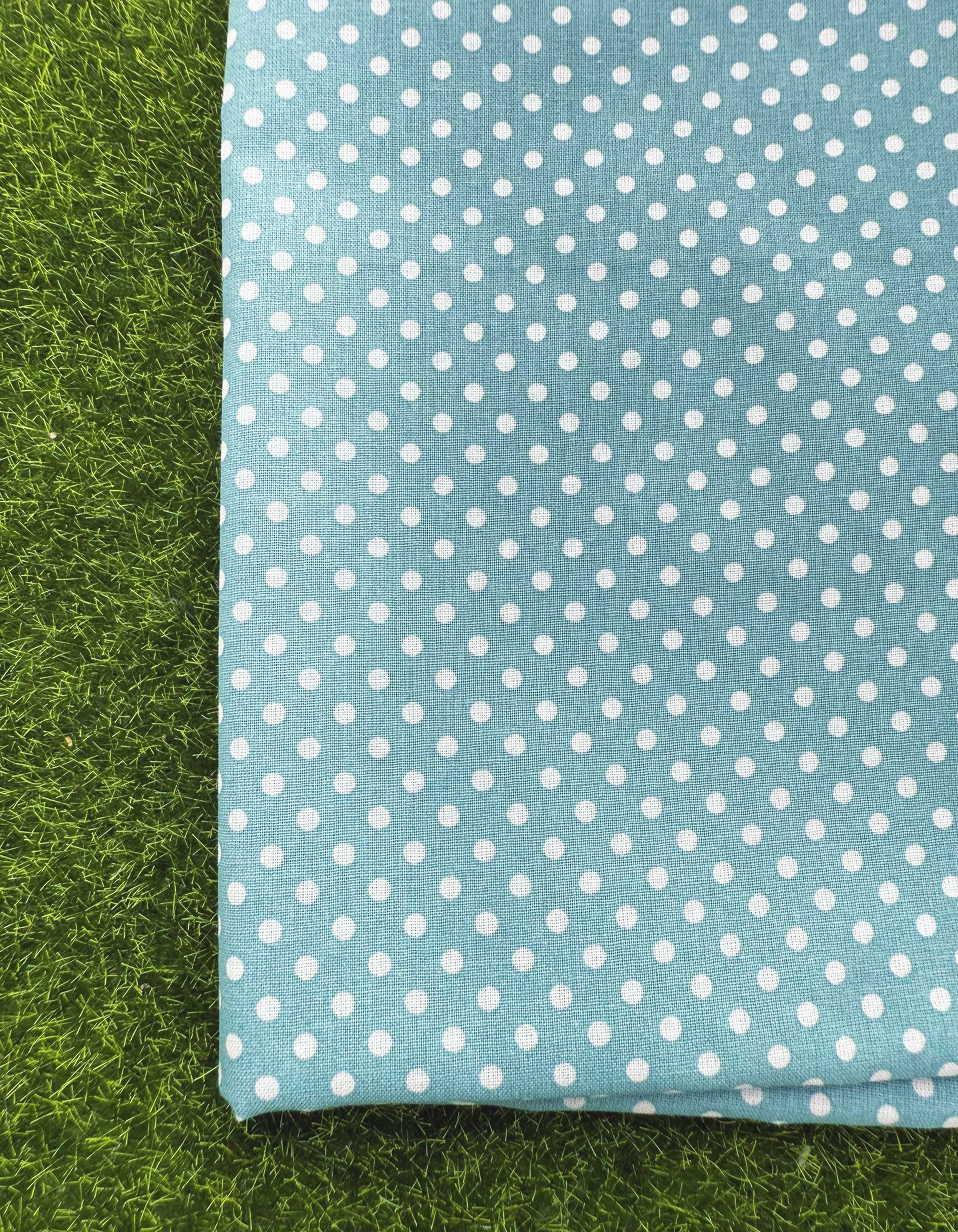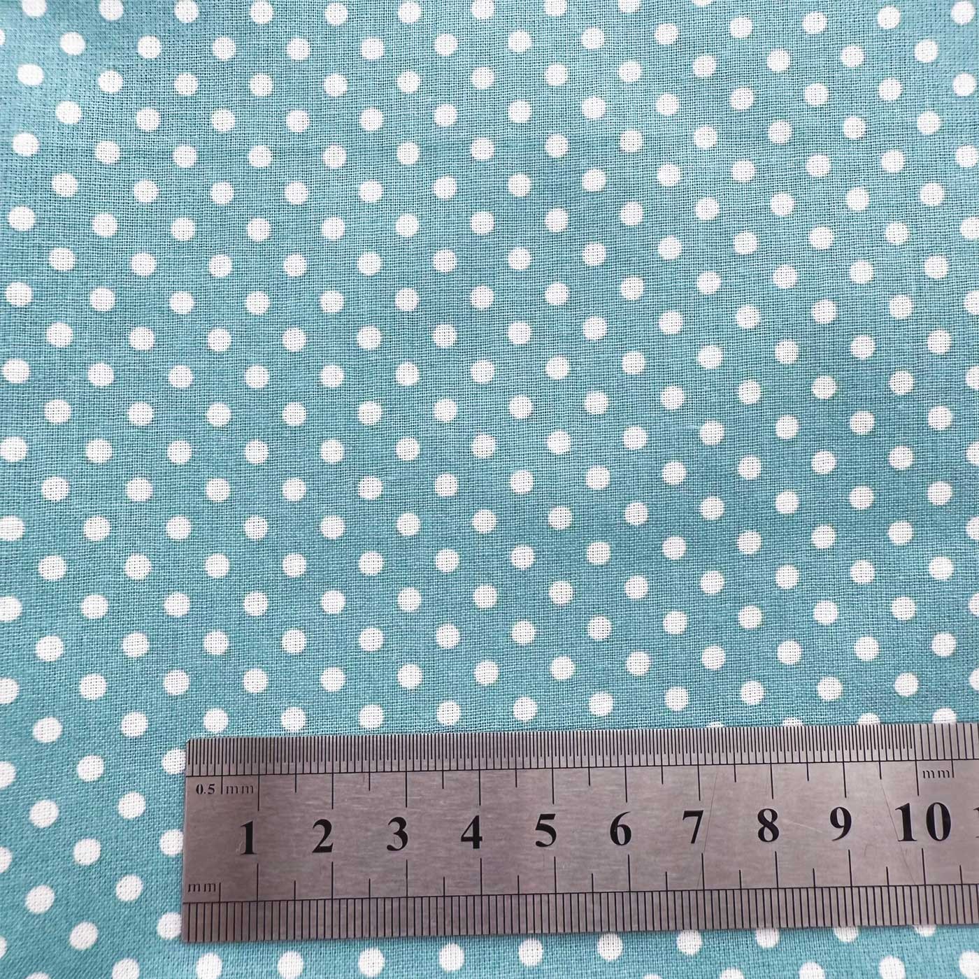Cretonne à pois blancs sur fond couleur bleu opale.