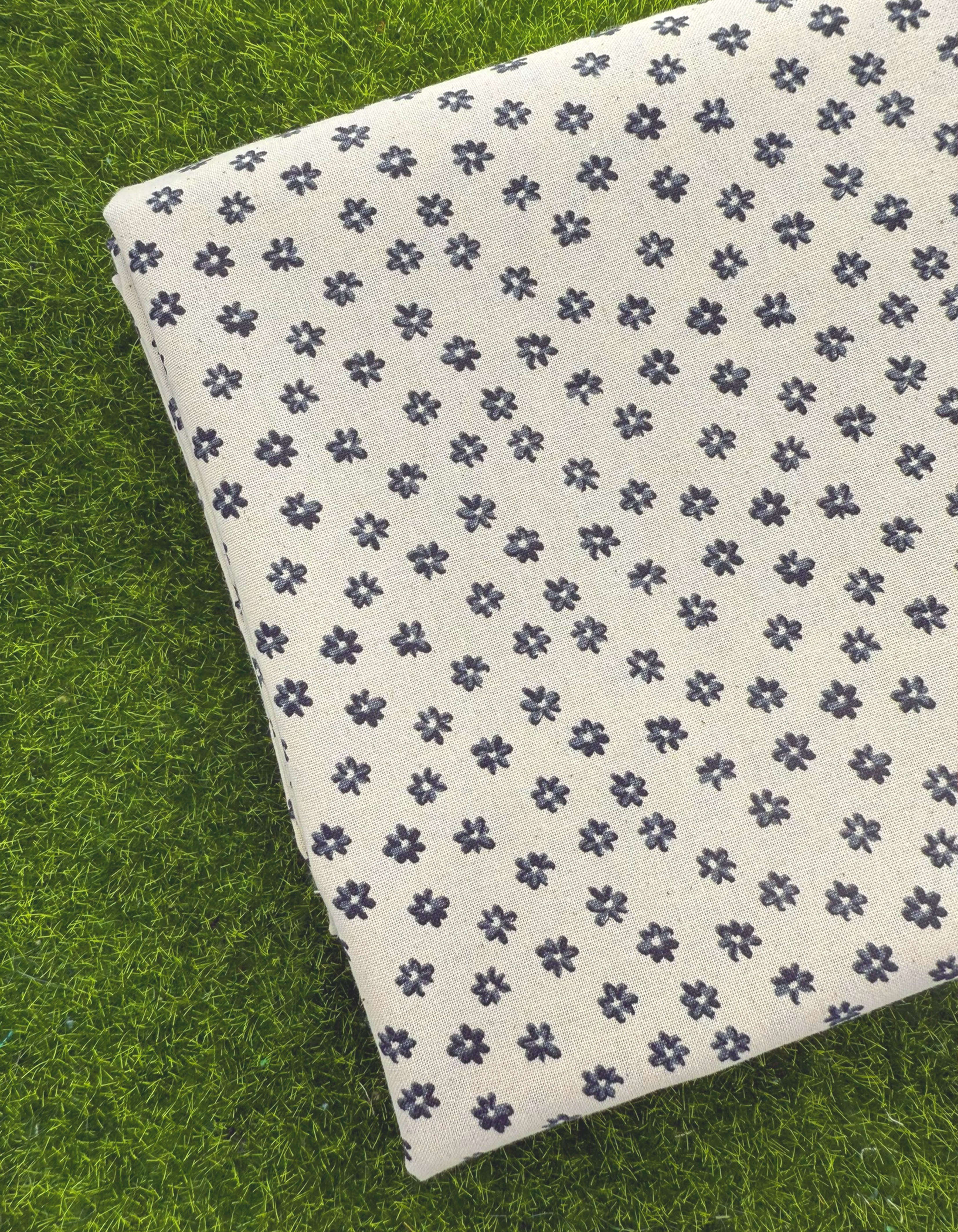 Cette cretonne 100% coton, non blanchie, présente de petites fleurs noires imprimées sur un fond écru naturel, pour un rendu authentique.