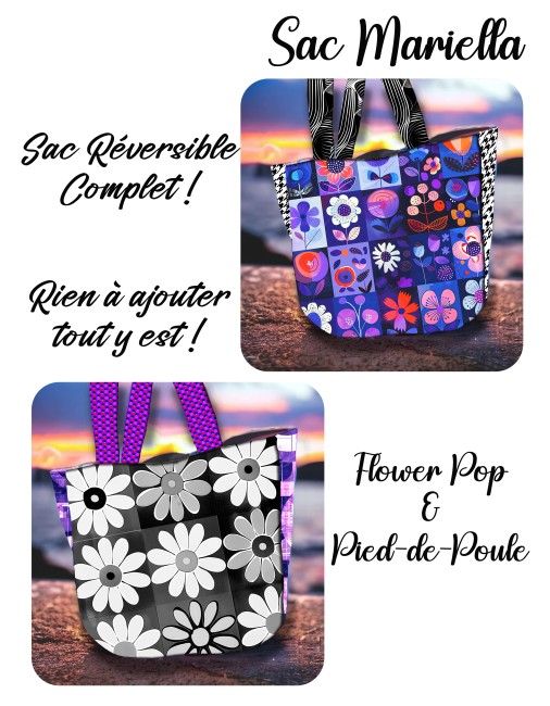 Le panneau contient toutes les pièces à découper, avec 4 faces de fond et 4 faces de côté que tu peux assembler à ton goût, pour créer un sac unique et 100 % personnalisé.