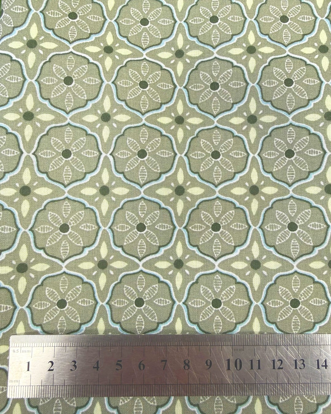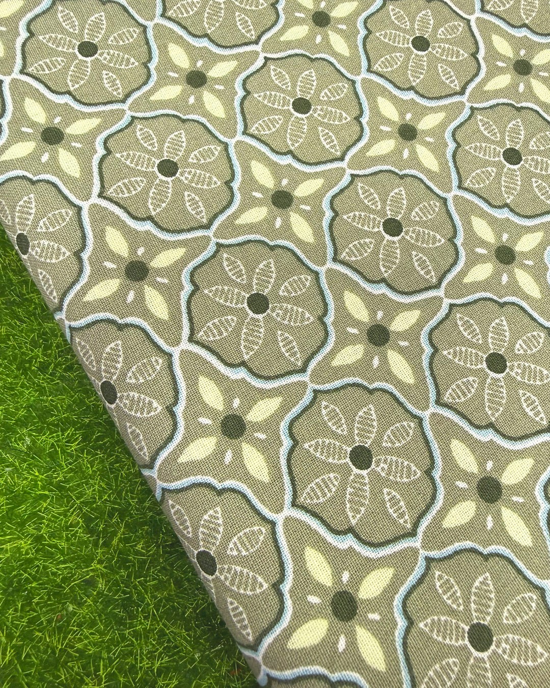 Tissu coton cretonne imprimé avec un motif graphique de fleurs stylisées dans des tons naturels.