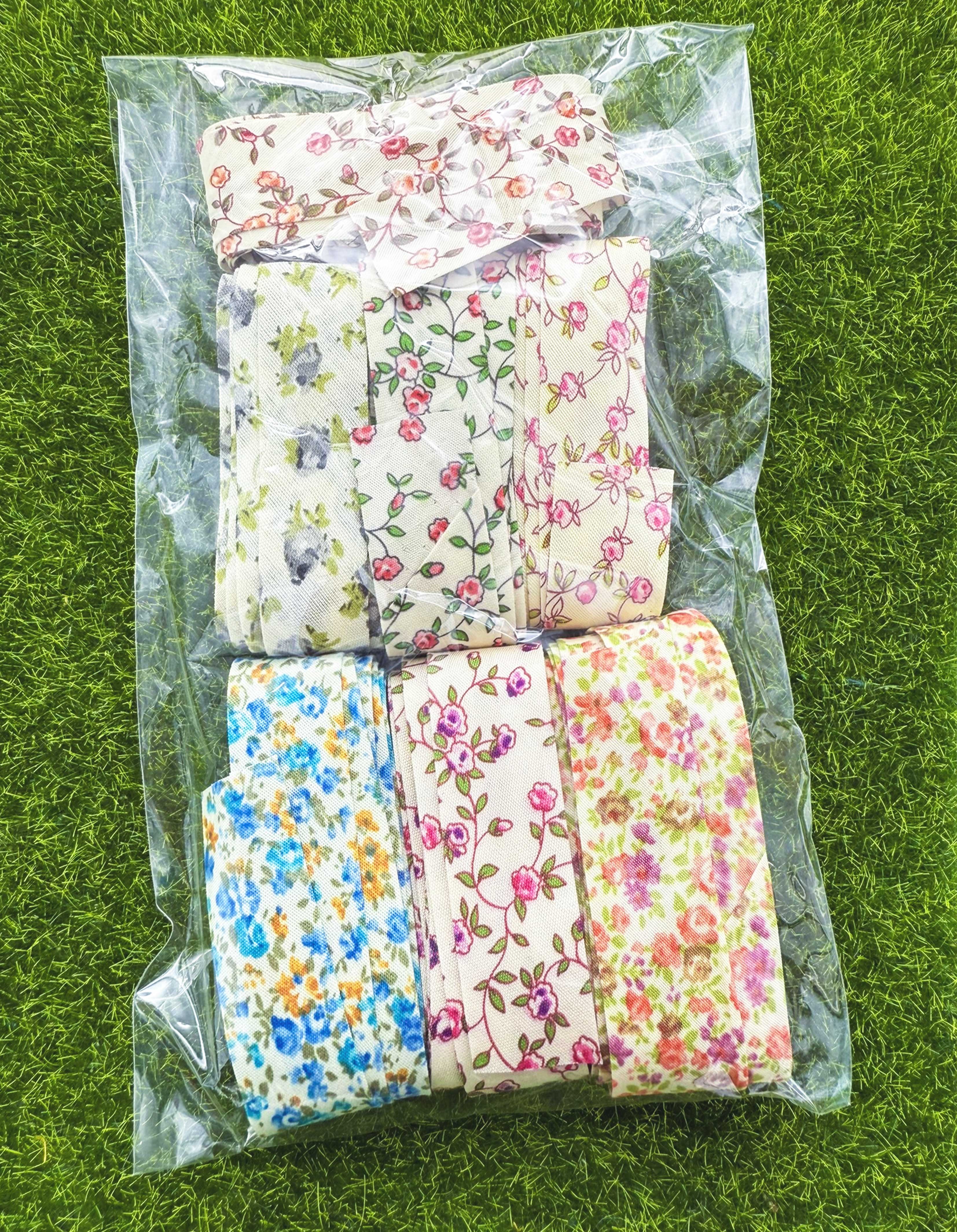 Ce lot contient 7 biais pliés en coton, chacun mesurant 3 mètres.