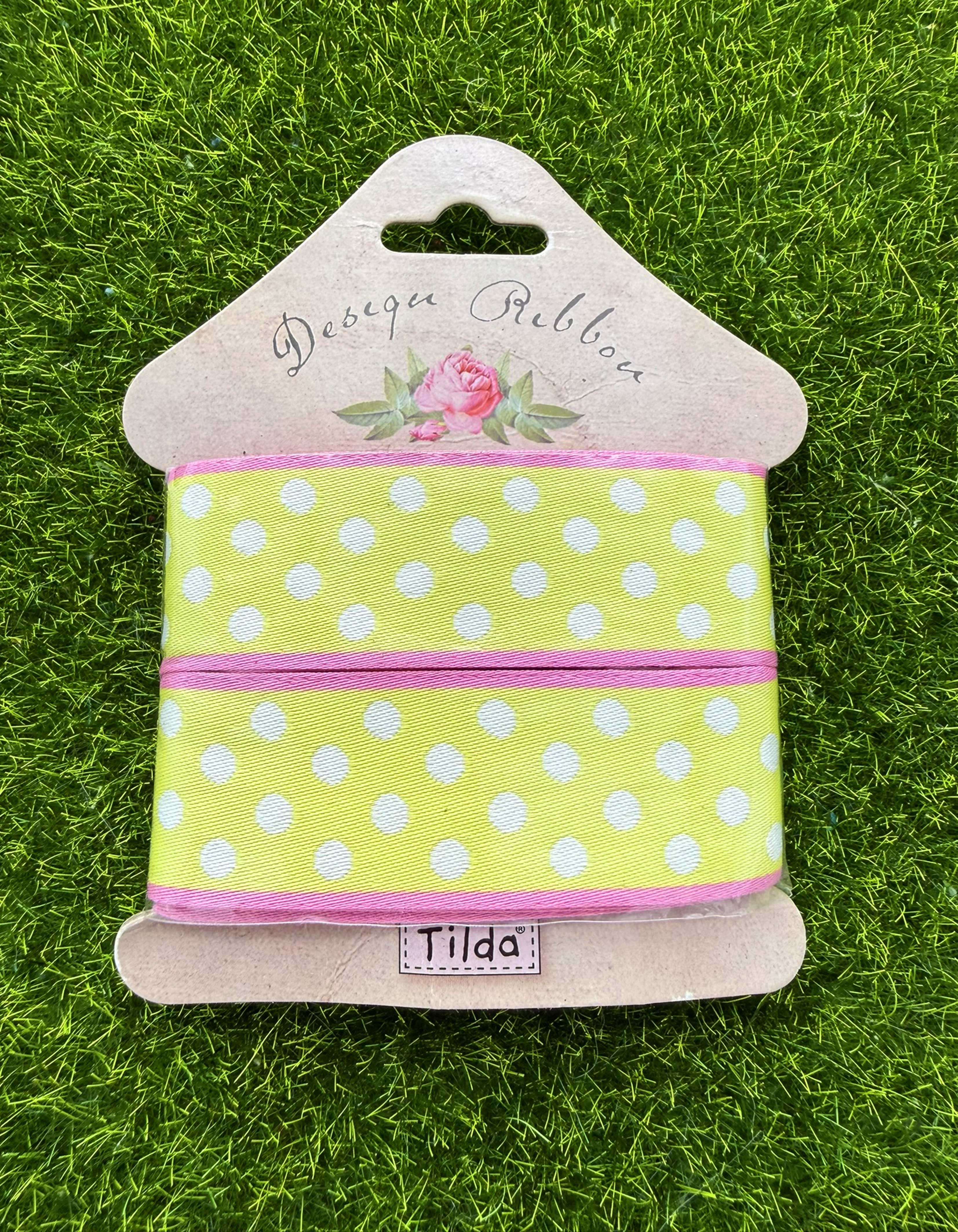 Ruban TILDA en tissu à pois blanc sur fond vert avec bandes roses.