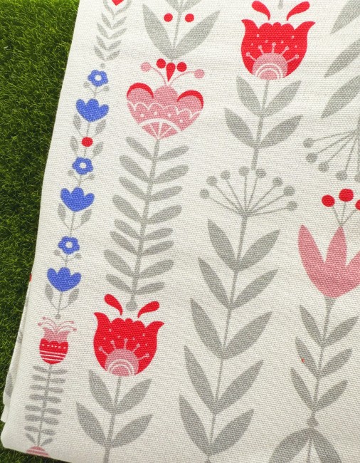 Ce canvas 100 % coton présente un motif de tulipes stylisées dans de jolis tons de rouge, bleu et gris sur fond écru. Sa toile fine mais résistante en fait un allié parfait pour les accessoires du quotidien comme pour la déco.