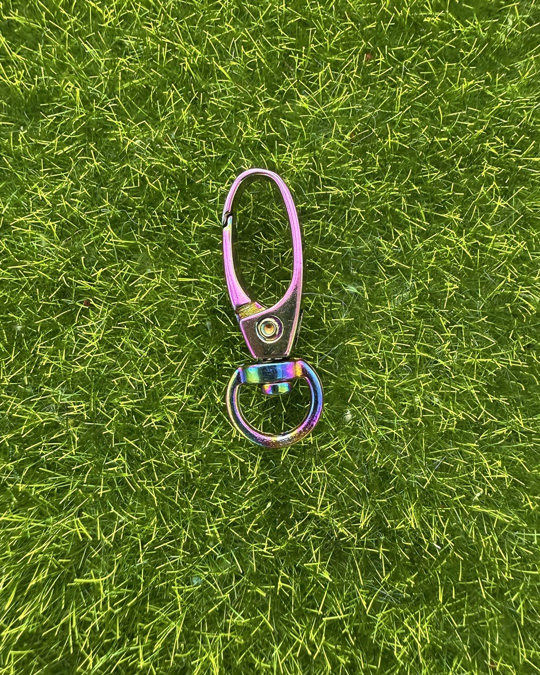 Petit mousqueton rotatif en métal avec finition multicolore, idéal pour la création de porte-clés ou accessoires DIY.