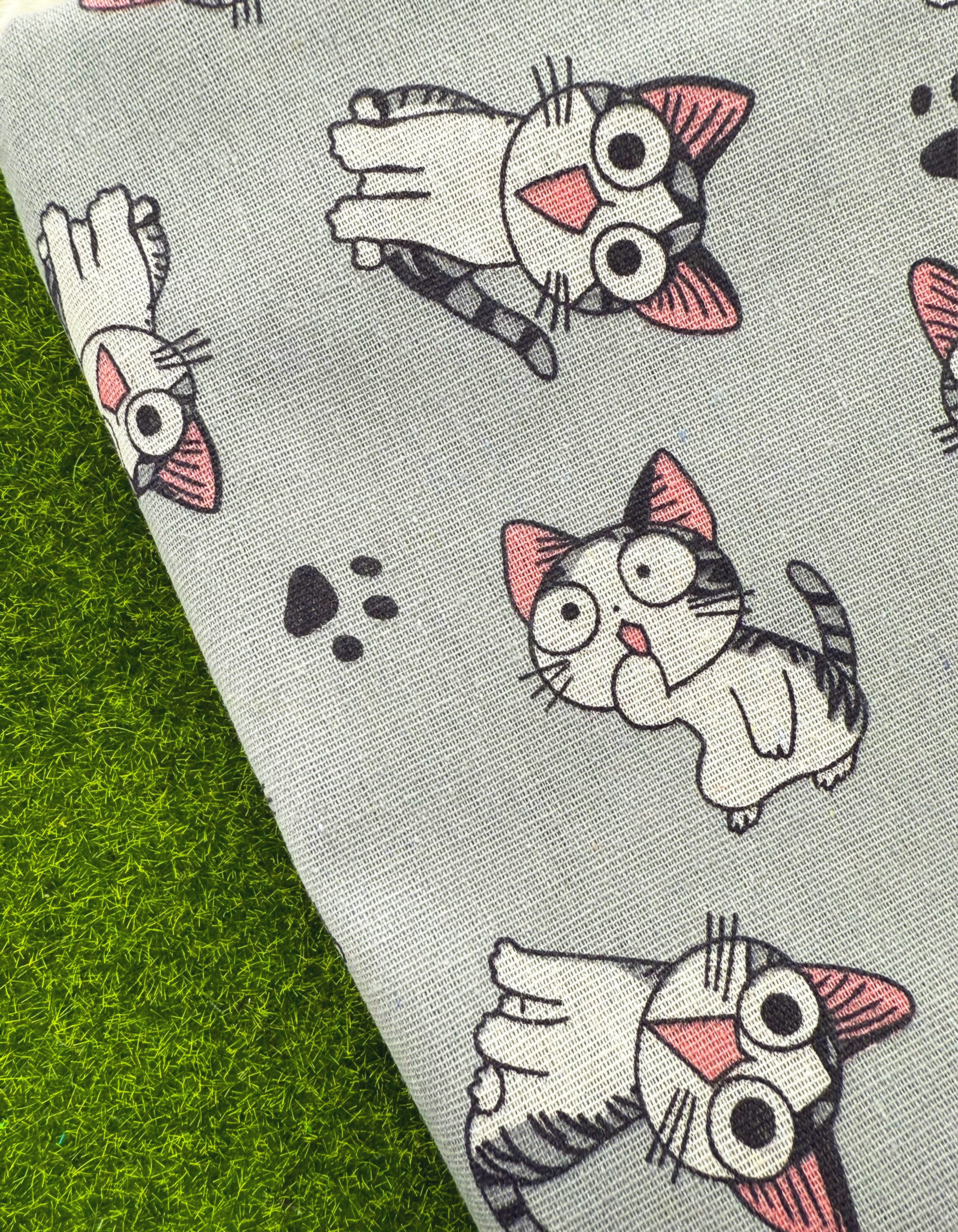 Toile en coton avec des motifs chats sur fond gris, ressemble au lin avec son tissage en toile.