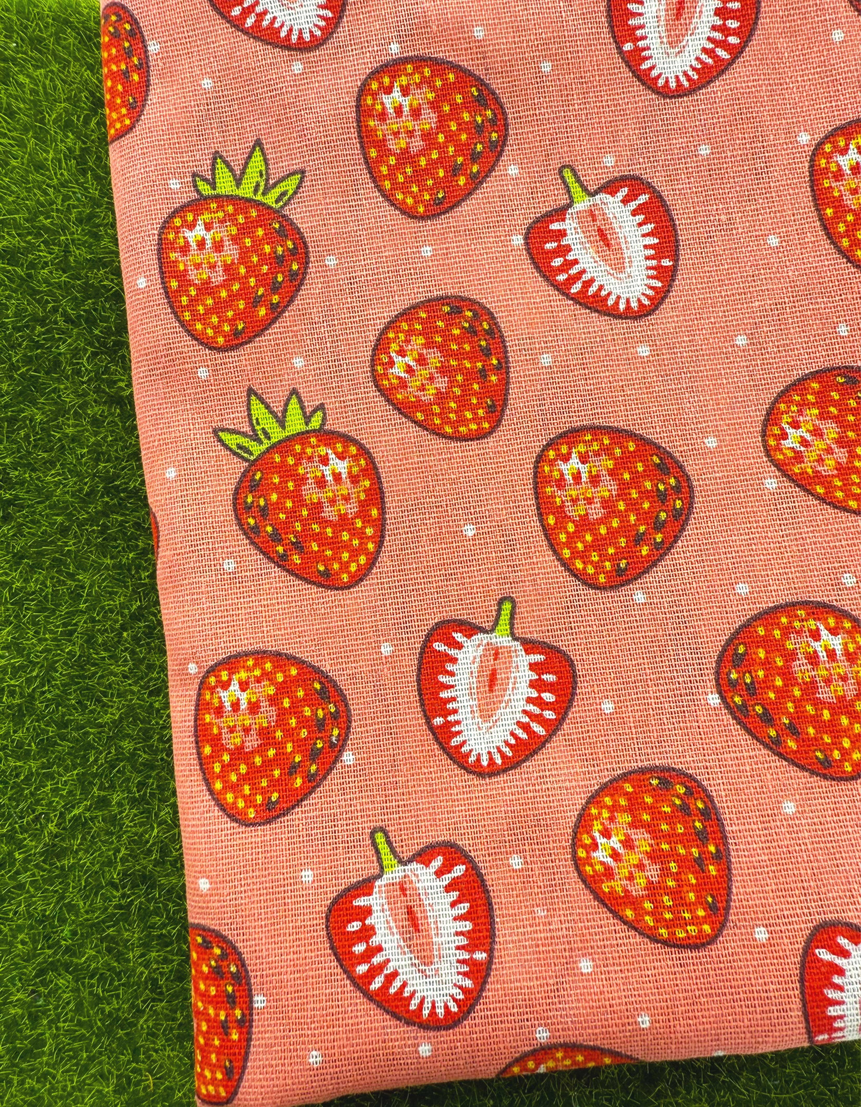 Tissu en coton motifs fraises sur fond rose, tissage en toile.
