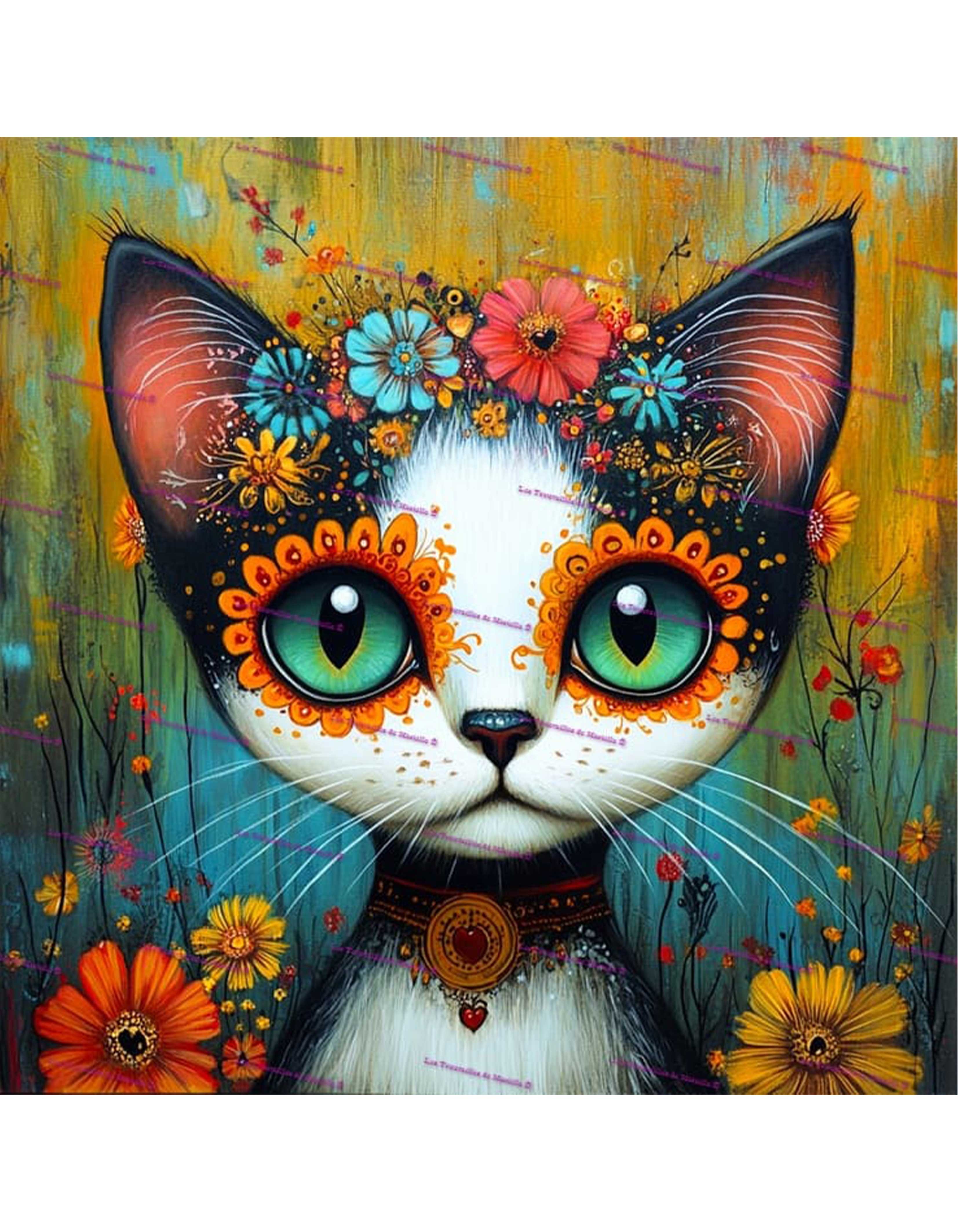 Un visuel unique qui mêle l’univers félin à l’art populaire mexicain : motifs floraux, regard profond et détails inspirés des calaveras, dans une ambiance vibrante et bohème.