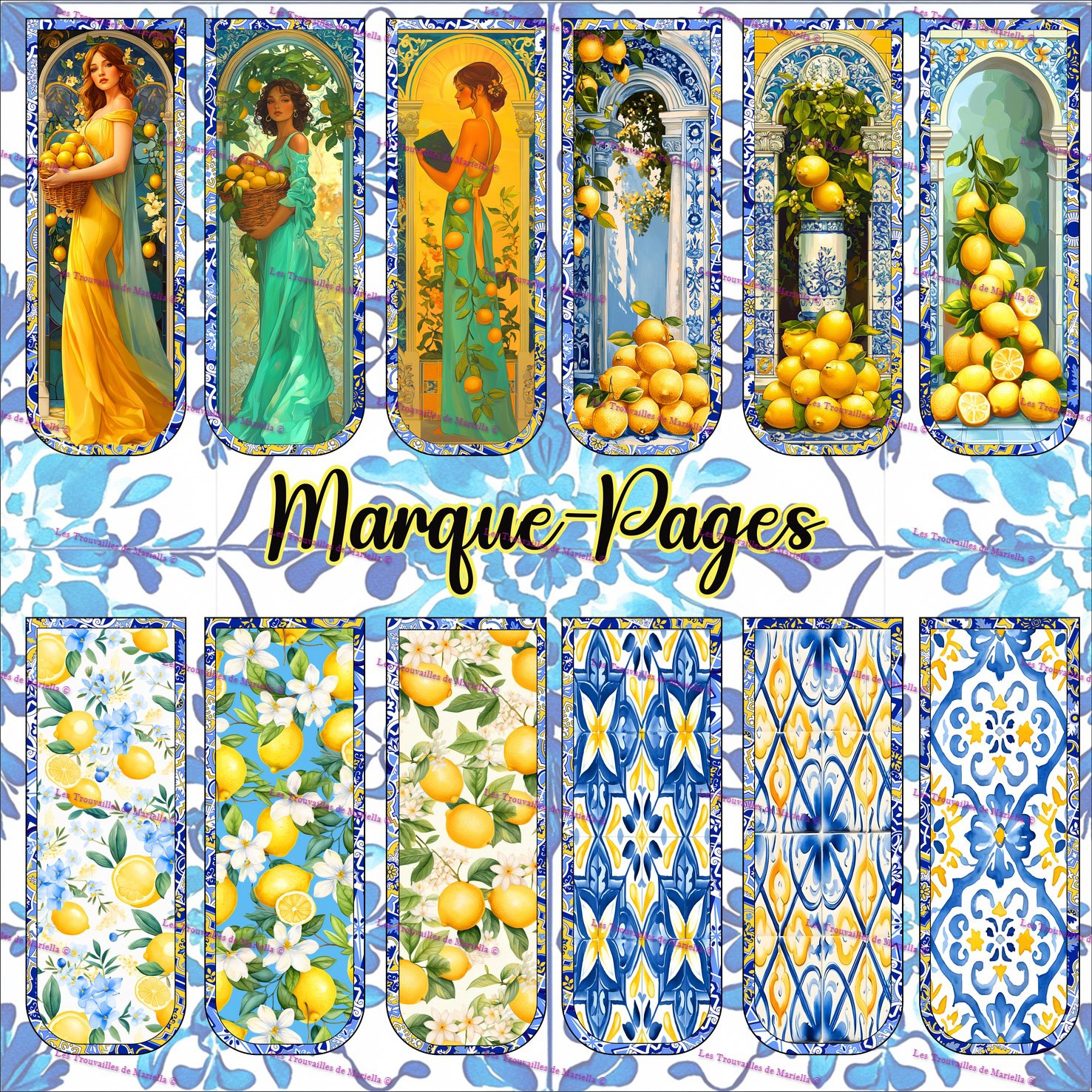 Ce panneau mêle citrons juteux, azulejos lumineux et silhouettes élégantes pour une série de marque-pages à la fois solaire et raffinée.