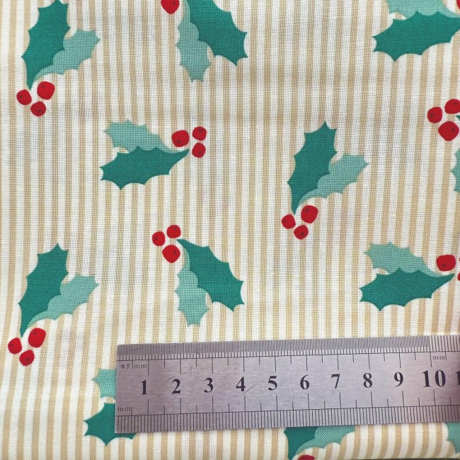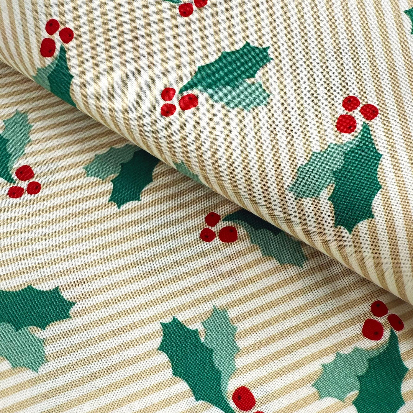 Ce joli coton à motif de houx sur fond rayé mêle tradition et légèreté : les petites feuilles vertes et les baies rouges s’y dessinent sur un fond beige rayé, parfait pour une décoration de Noël douce et naturelle 🌿