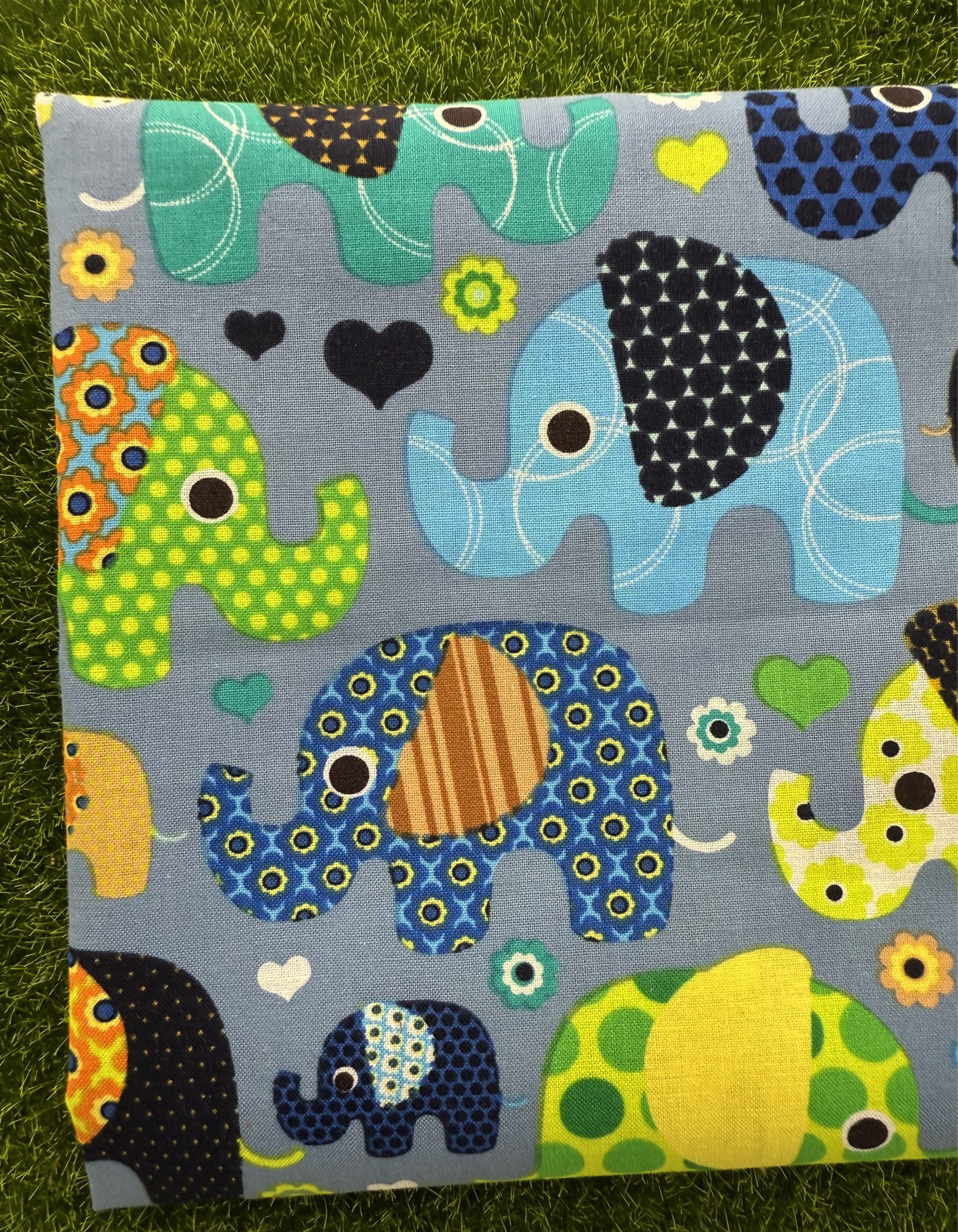 Ces éléphants aux motifs géométriques et floraux se promènent sur un fond gris doux, formant un tissu à la fois ludique et moderne. Parfait pour des créations enfants, des accessoires déco ou des coutures pleines de bonne humeur !