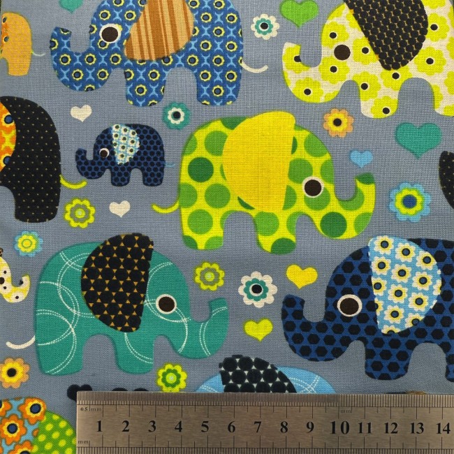 🐘 Coupon coton Oeko-Tex® – Éléphants colorés sur fond gris