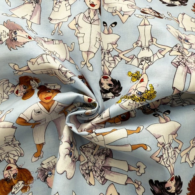 Signé Loralie Harris, designer américaine installée dans le Colorado, ce coton met en scène des infirmières aux expressions vives et pleines de caractère.