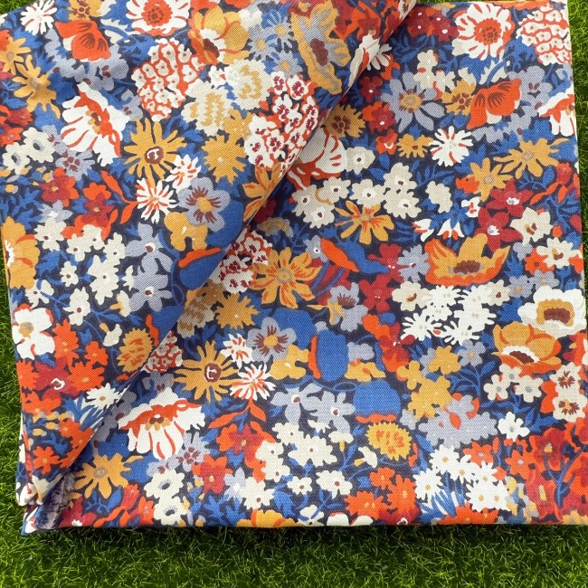 Un coupon fleuri plein de vie avec une explosion de couleurs chaudes : rouge brique, moutarde, bleu profond et touches d’ivoire.