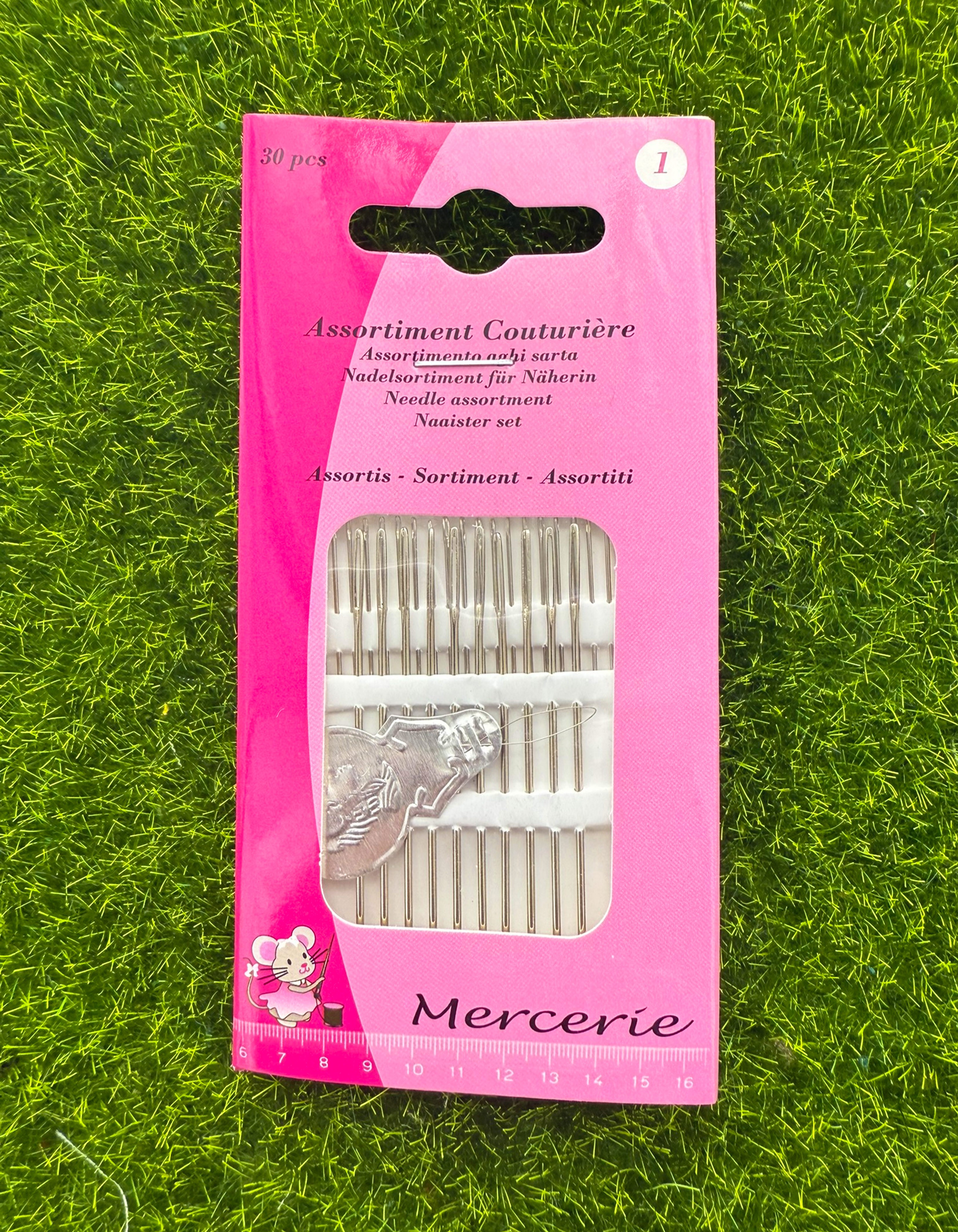 Plaquette de 30 aiguilles à coudre (100 % acier carbone) + 1 enfileur métallique.