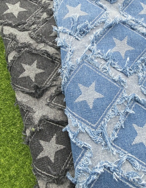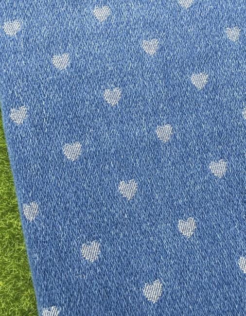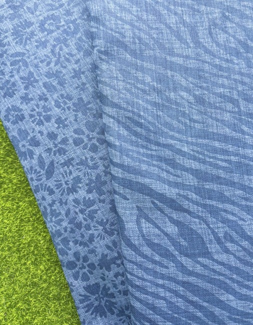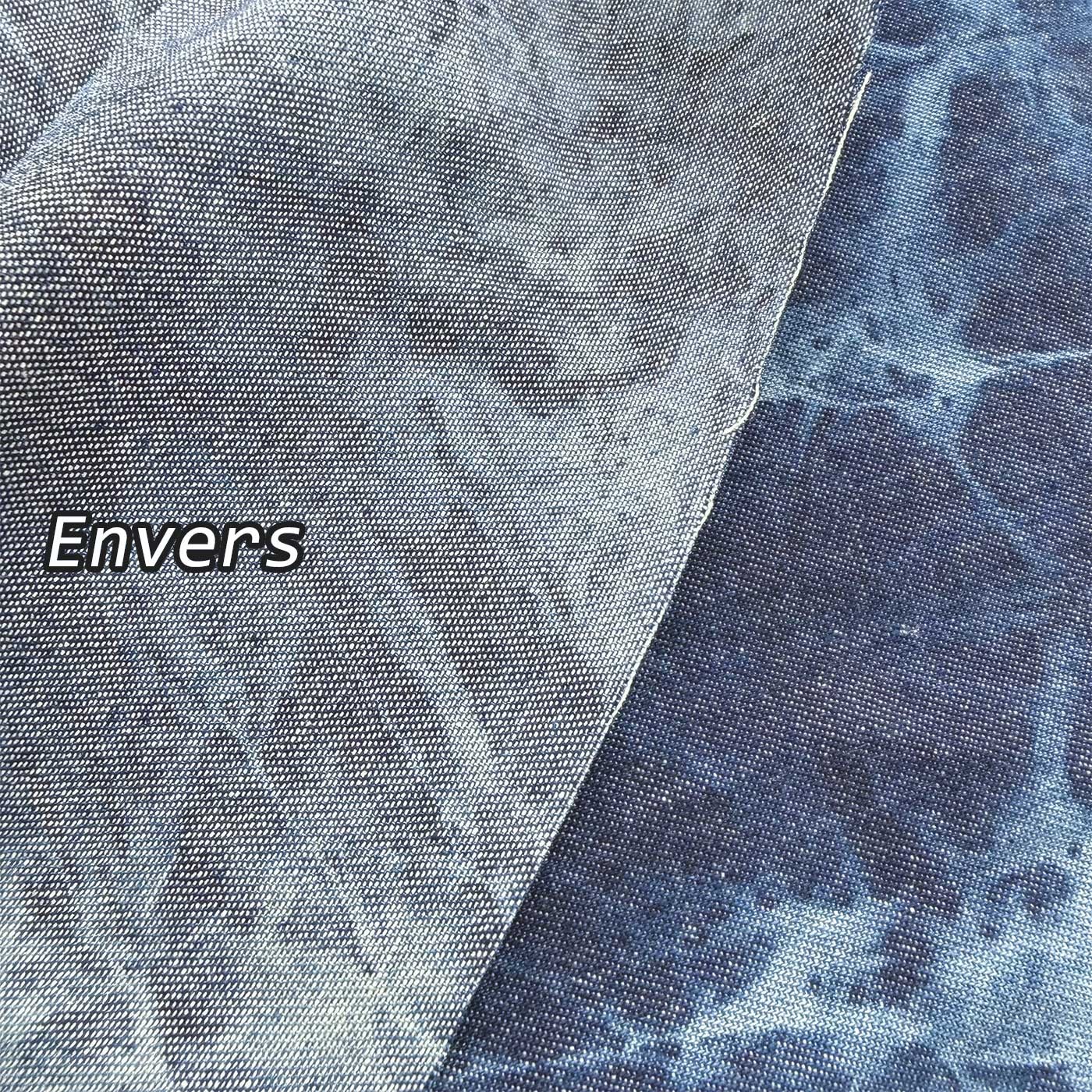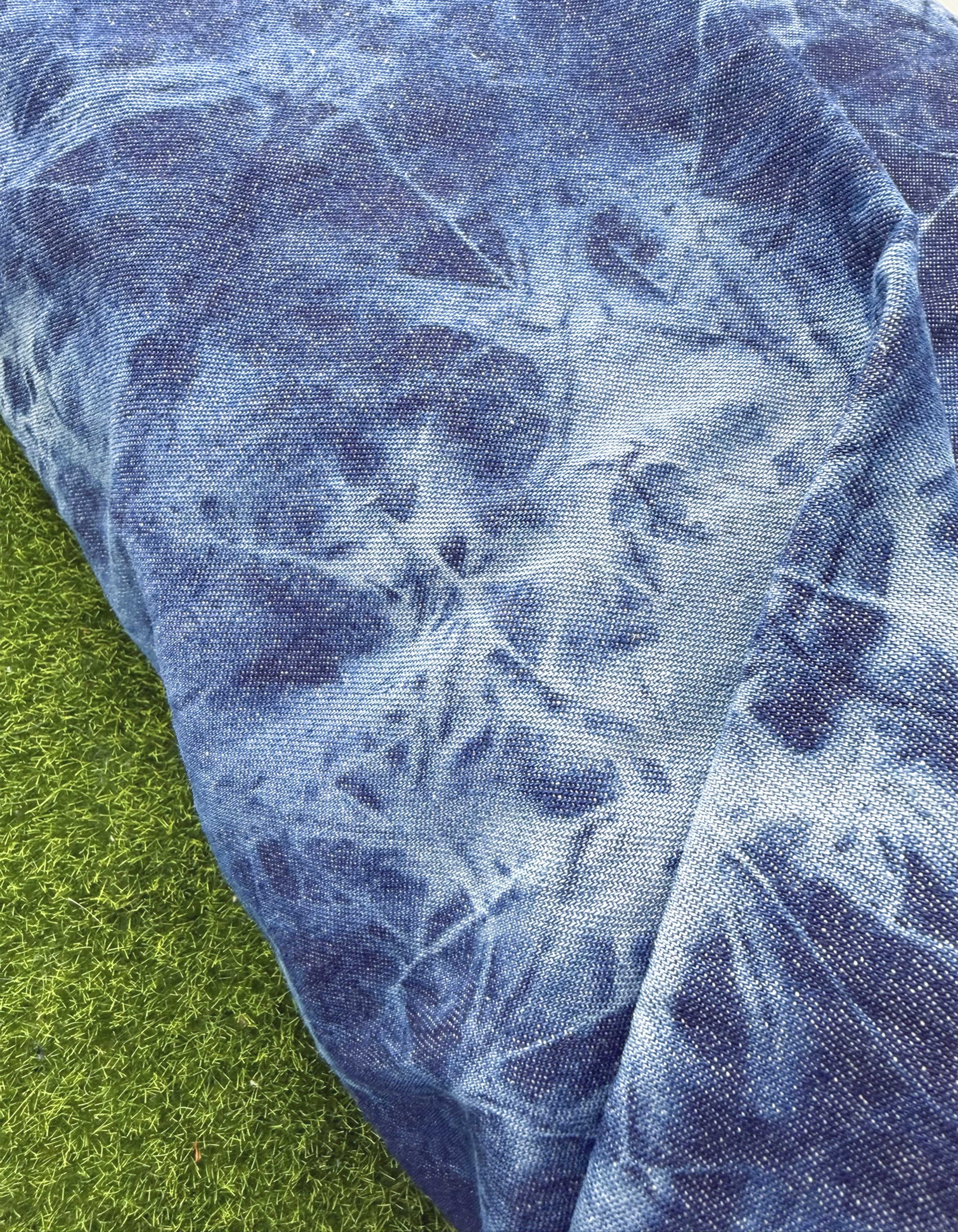 Ce tissu jean tie & dye bleu présente un motif irrégulier, avec des nuances variables d’une coupe à l’autre, caractéristiques de cette technique d’impression.
