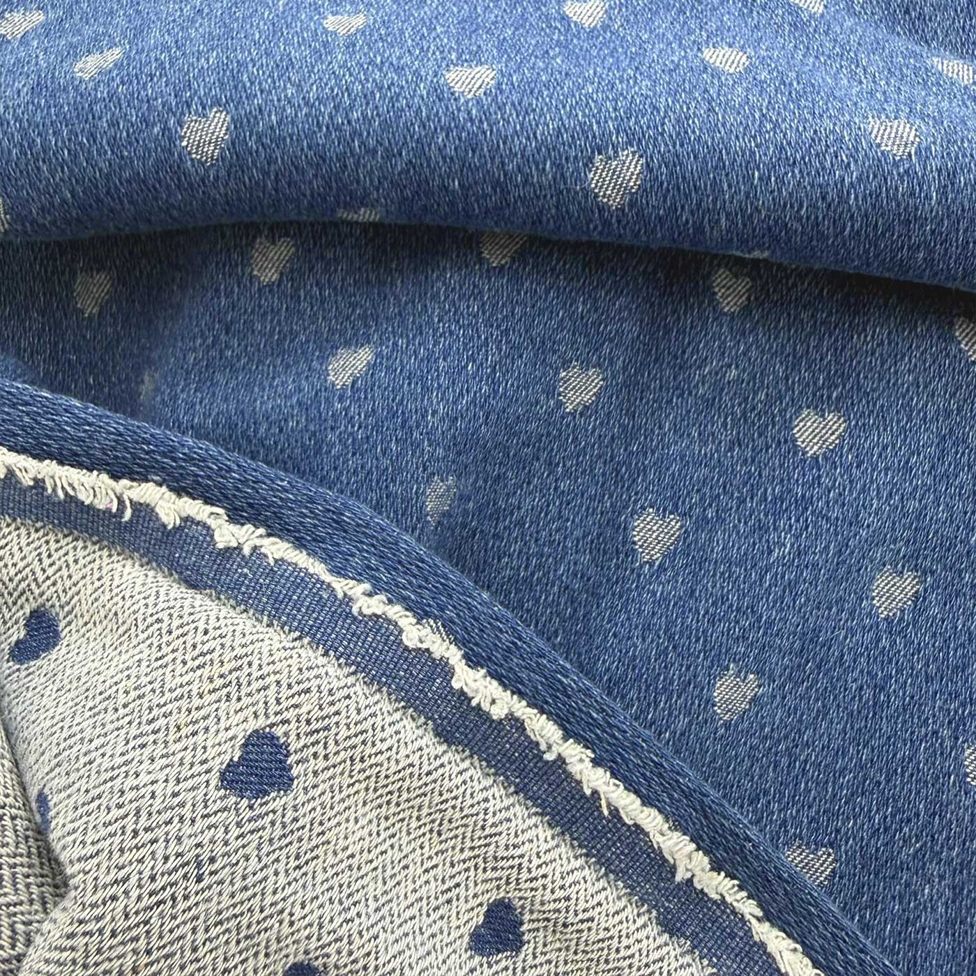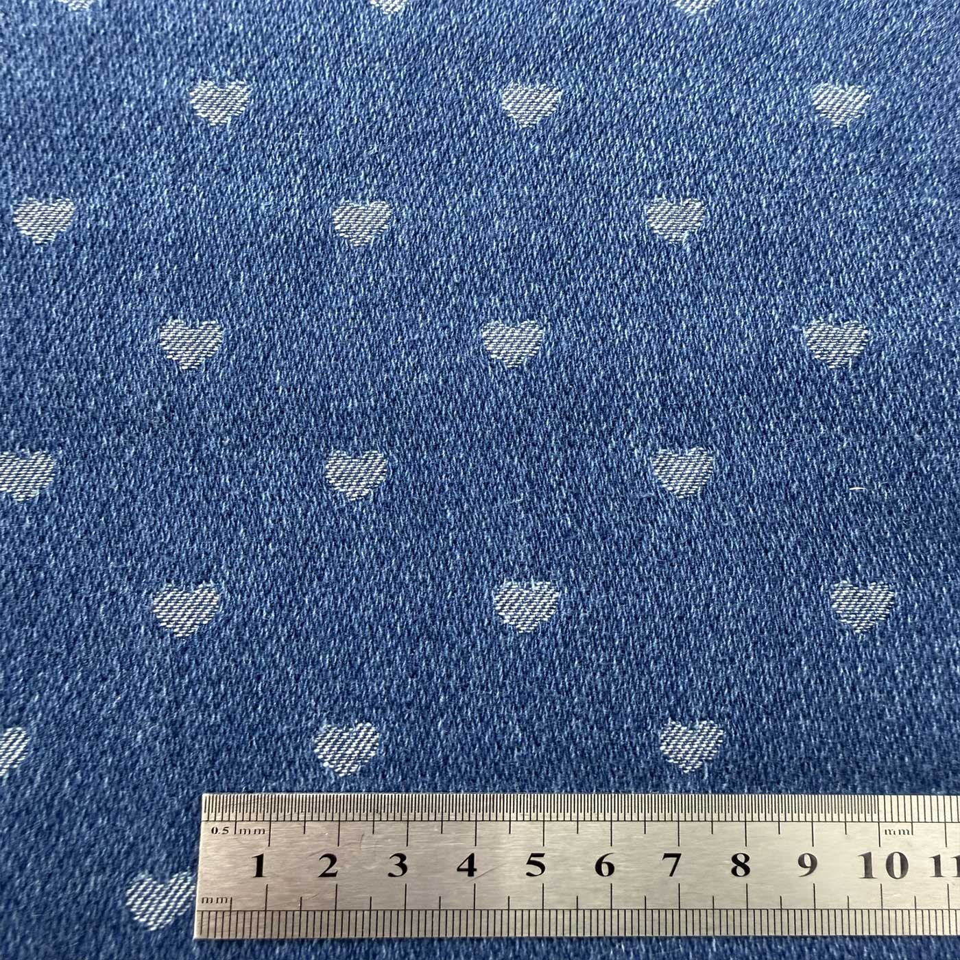 Tissu jean non extensible, à motif cœurs, tissé en jacquard et non imprimé.