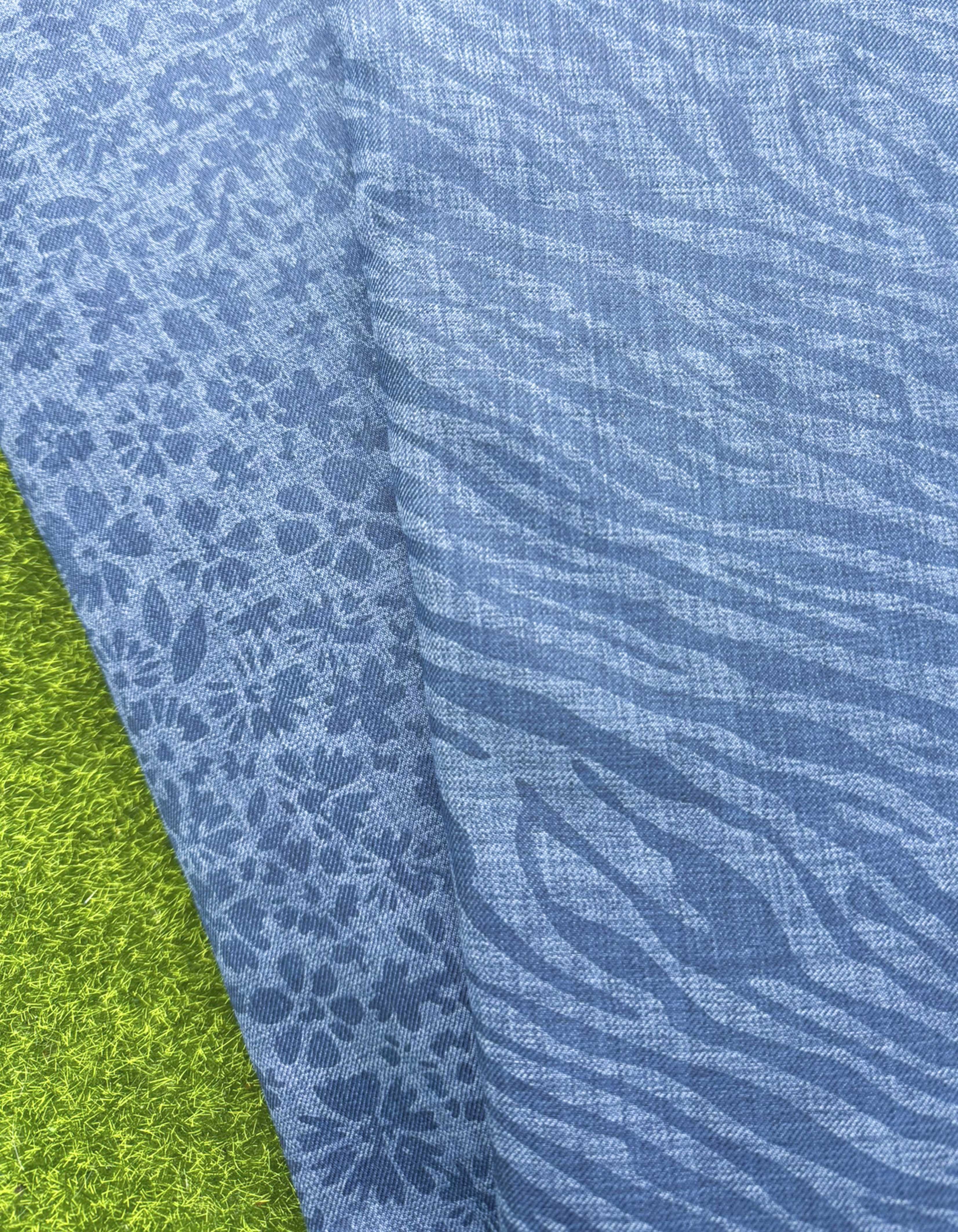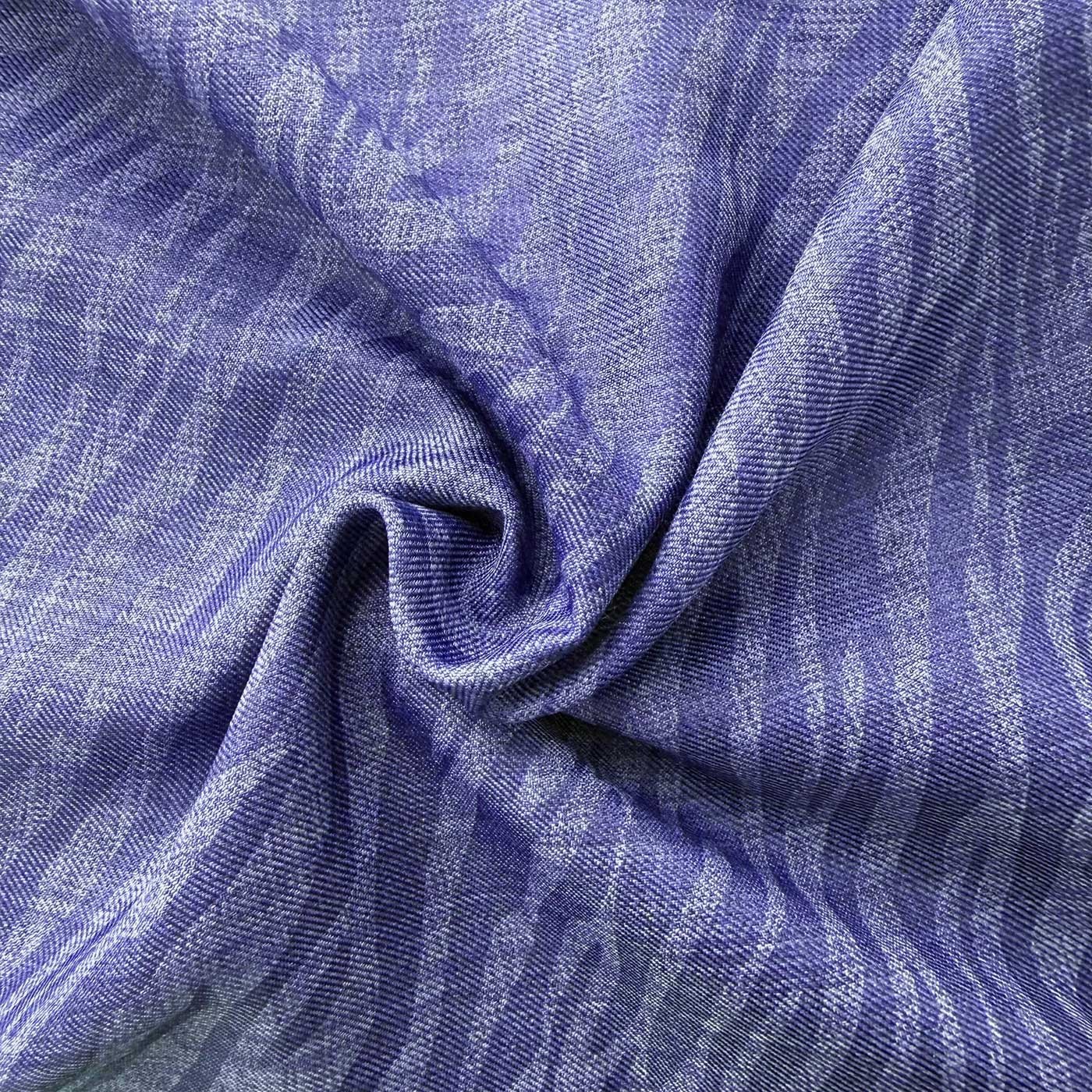 Ce tissu présente un effet chambray visuel, obtenu par un tissage mêlant différentes nuances de bleu, pour un rendu non uniforme, proche de l’aspect du denim, sans en être.
