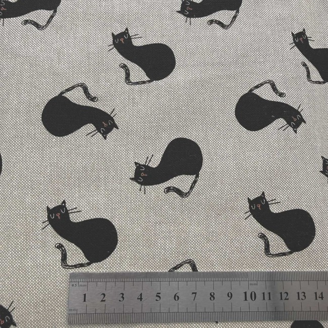 Le motif met en scène de petits chats noirs stylisés, répartis régulièrement sur un fond naturel, avec un rendu graphique sobre mais amusant.
