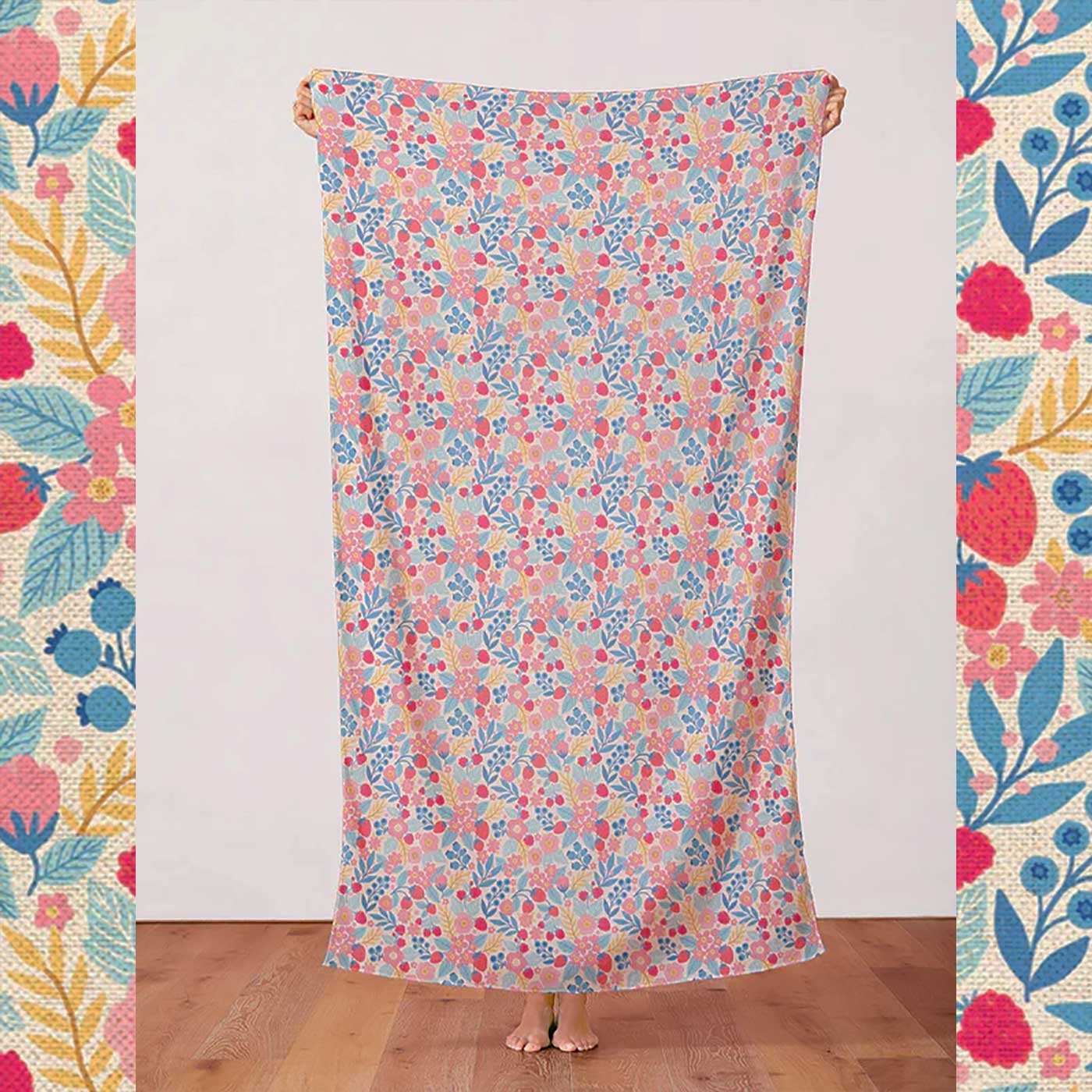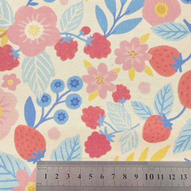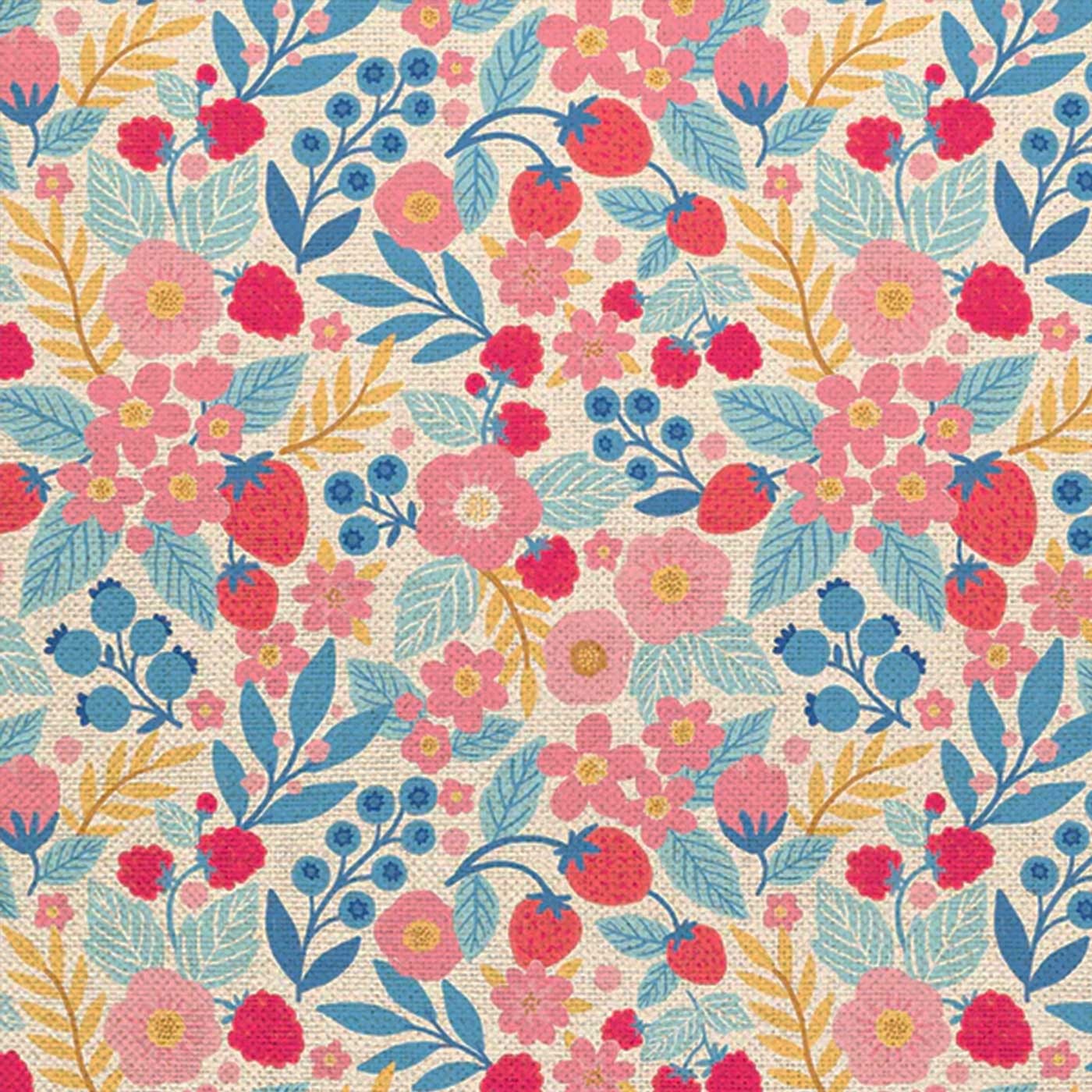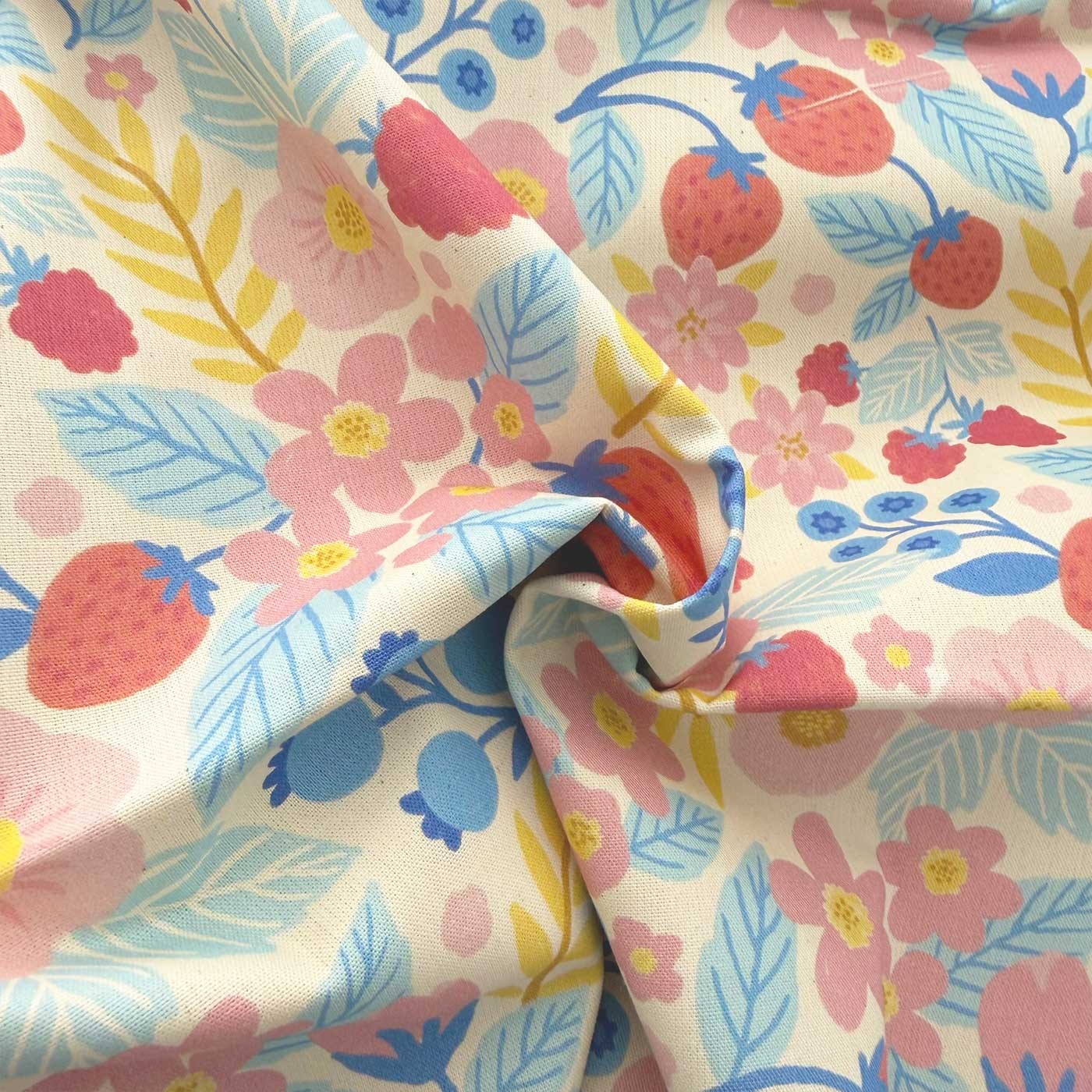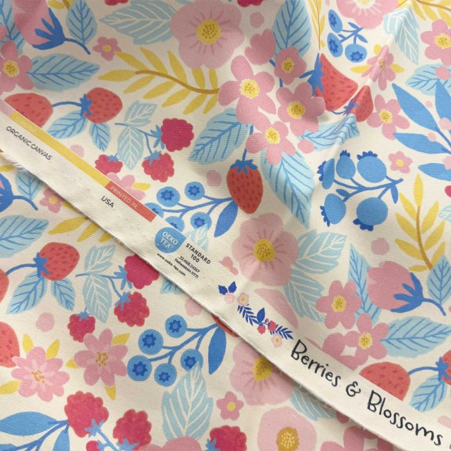 Cette toile en coton biologique met à l’honneur un motif floral et fruits des bois, aux couleurs fraîches et équilibrées.