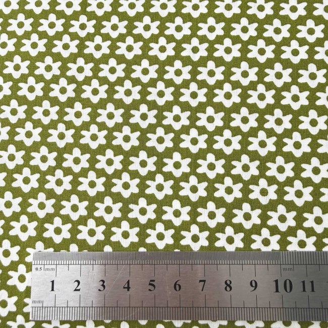La popeline assortie, à petites fleurs blanches sur fond kaki, joue le rôle de parfait contrepoint : plus discrète, elle équilibre l’imprimé principal et facilite les associations (doublures, poches, parementures…).