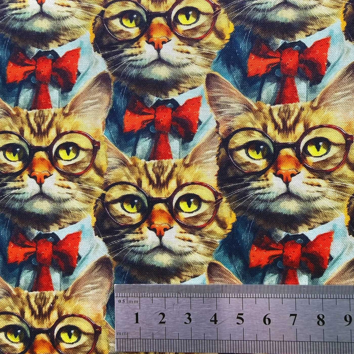 Ce coton imprimé met en scène un chat élégant, au regard vif, dessiné avec beaucoup de détails et de personnalité. Le fond coloré et le contraste du nœud papillon rouge apportent du relief sans être criards.