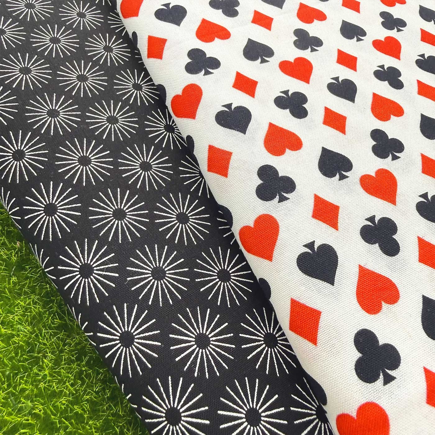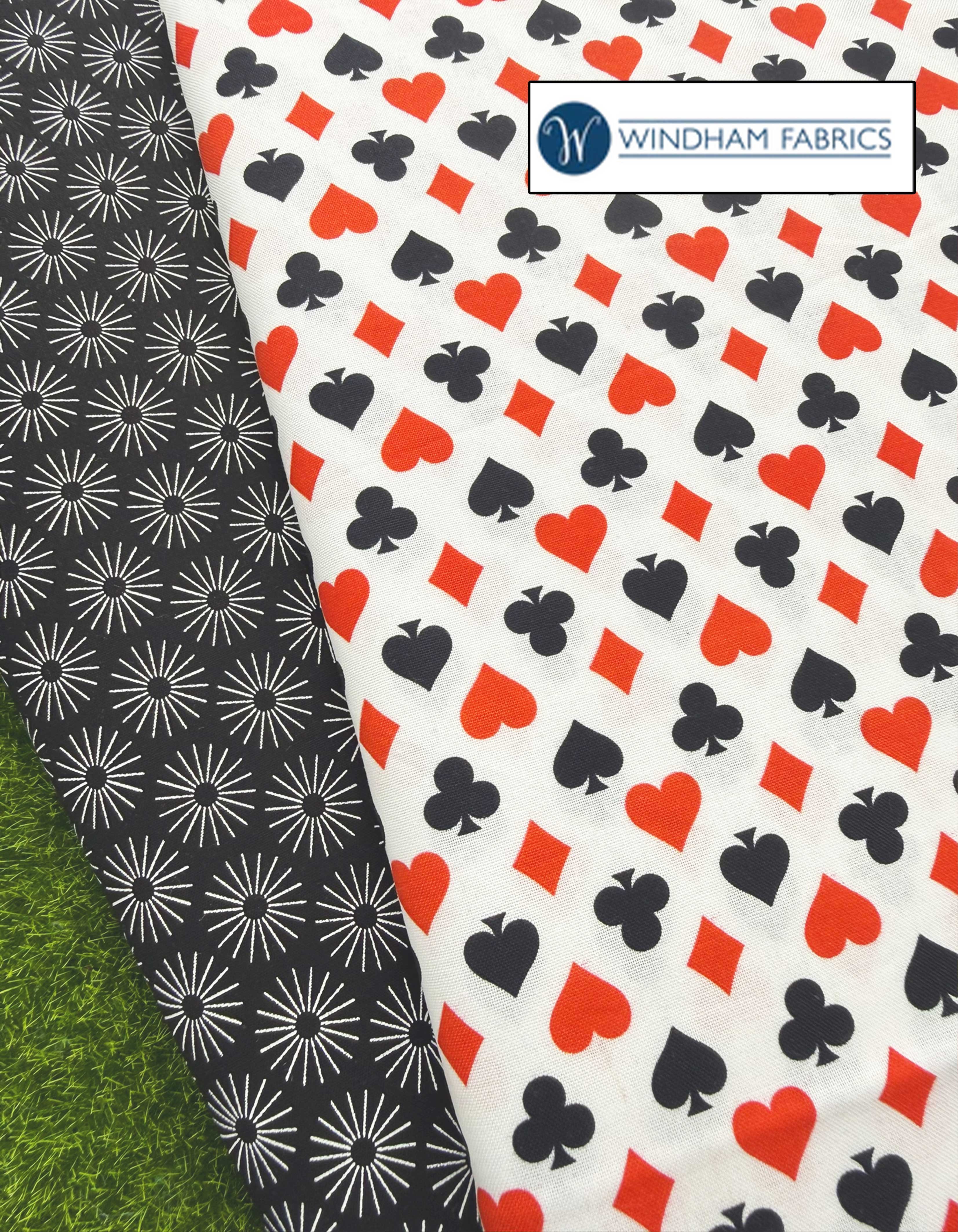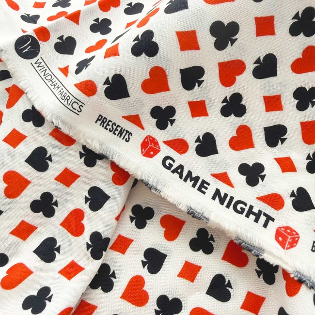 Le tissu Game Night de Windham Fabrics reprend les symboles emblématiques des cartes à jouer — cœurs, piques, trèfles et carreaux — dans une palette rouge et noire sur fond blanc, pour un rendu graphique, rythmé et intemporel.