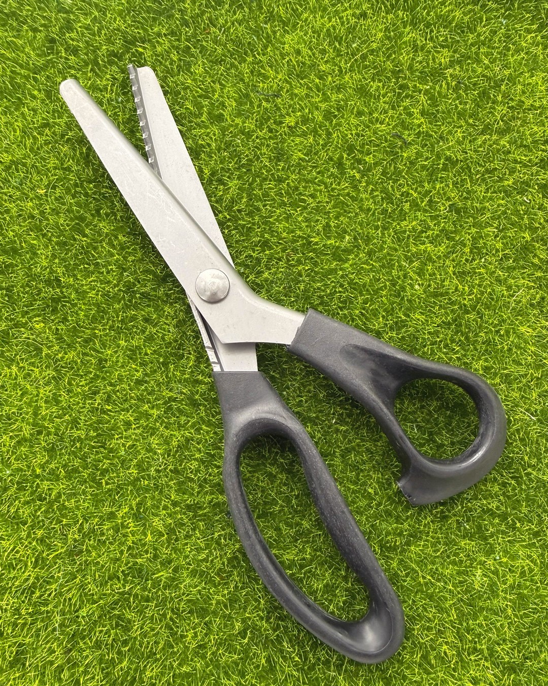 Ciseaux cranteurs pour la découpe de tissus. Les lames en zigzag permettent de limiter l’effilochage des bords et d’apporter une finition décorative.