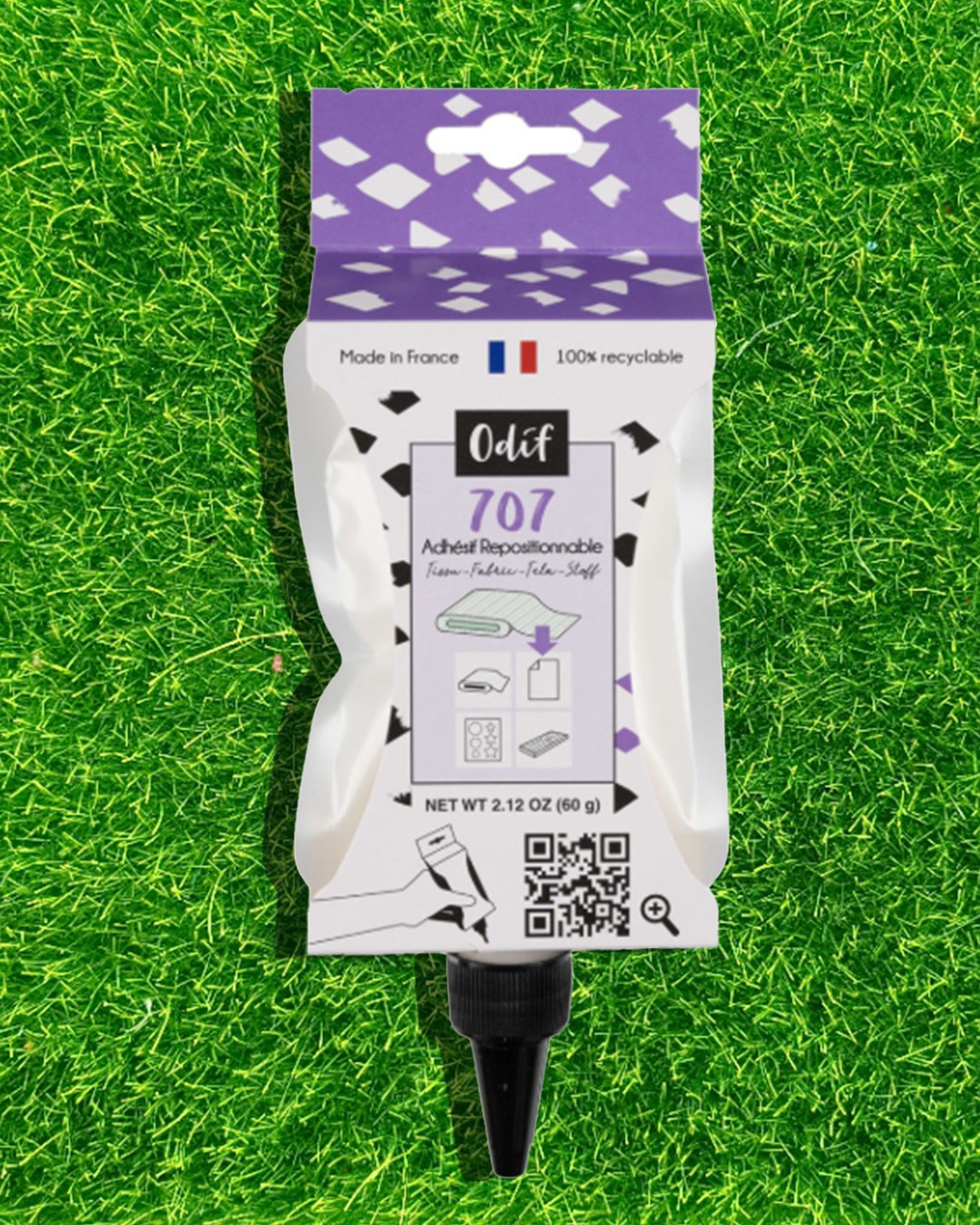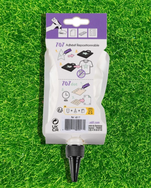 La colle textile repositionnable Odif 707 permet de maintenir temporairement les tissus et éléments textiles sans avoir recours aux épingles.