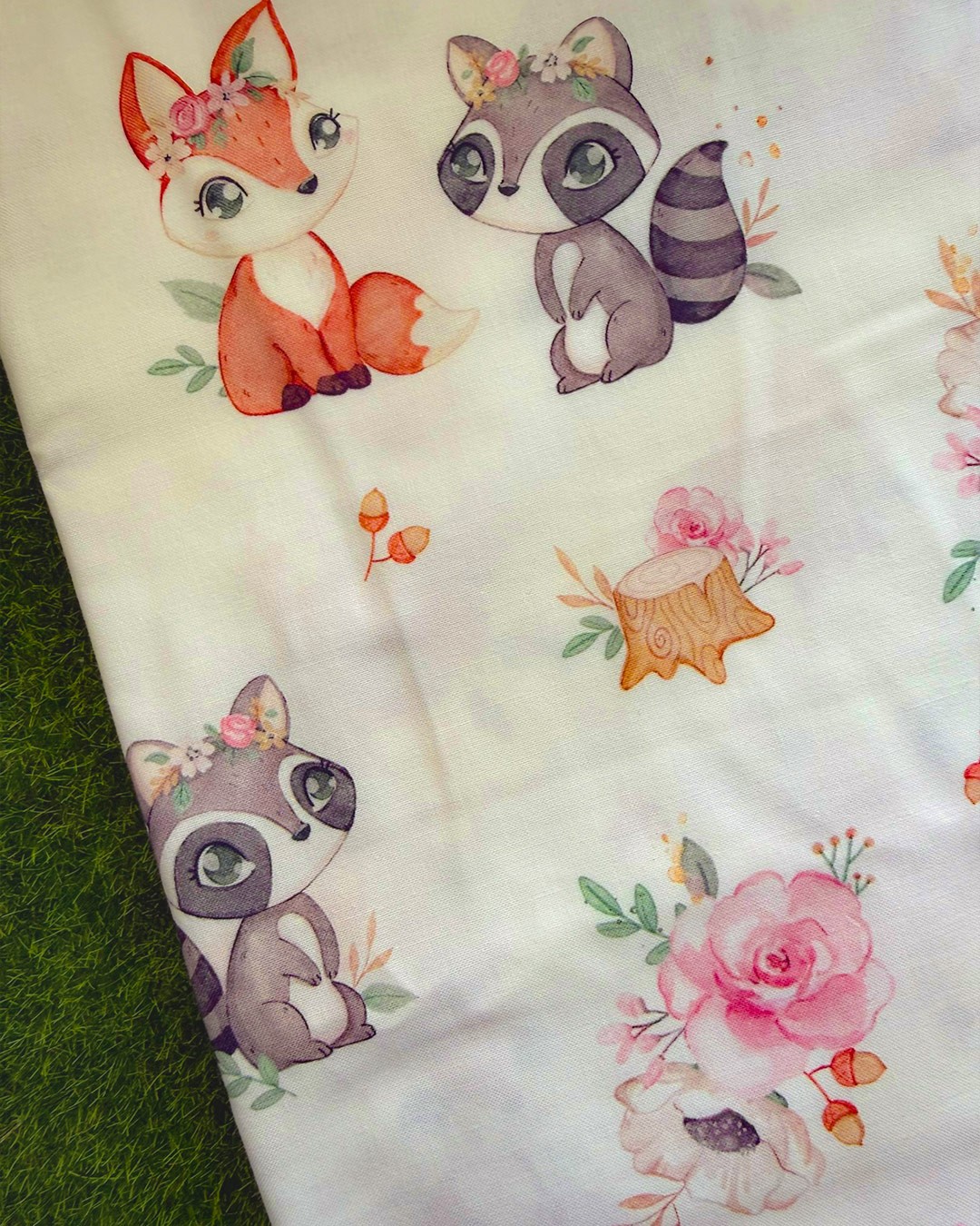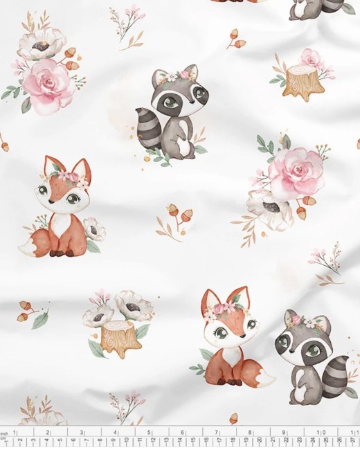Un imprimé tout en douceur, avec ses petits renards et ratons laveurs entourés de fleurs légères.
