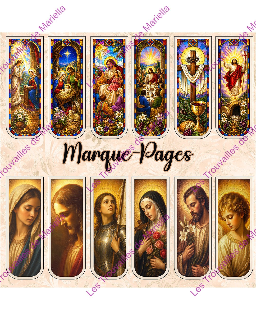 Ce panneau réunit 12 marque-pages illustrés sur le thème biblique et religieux, dans un esprit vitrail coloré et chaleureux. Scènes sacrées, symboles chrétiens et portraits empreints de douceur composent un ensemble original à coudre soi-même.